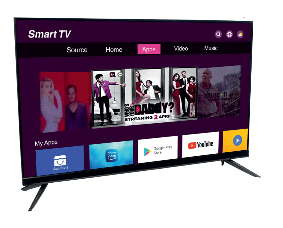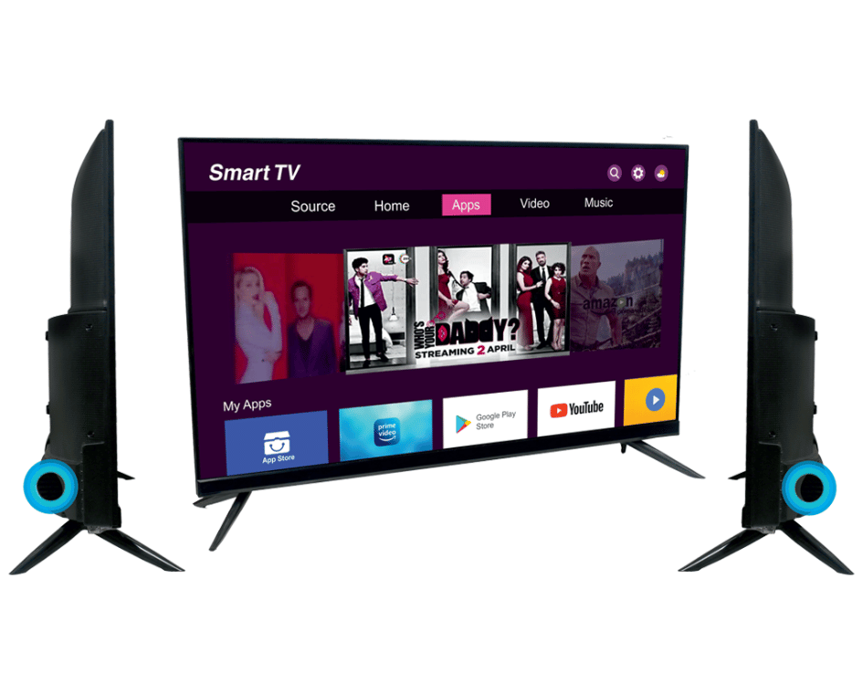 32-inch HD Ready Smart TV, A+ bezel-less panel, 1366×768 resolution, Android 9.0, CLOUD Lite UI, quad-core CPU, 512MB RAM, 4GB storage, built-in Wi-Fi, 2 HDMI, 2 USB, 24W side-firing speakers, app store, screen mirroring, 1-year warranty.