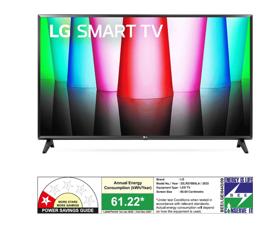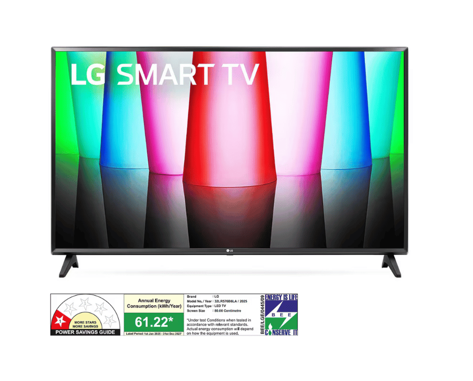 32 inch HD Ready Smart TV with α5 Gen6 AI Processor, Active HDR, HDR10, HLG, 8 Picture Modes, Clear Voice Pro, Dynamic Tone Mapping, Magic Remote, WebOS 23 OS, OTT apps like Netflix, Prime Video, YouTube, Disney+, HGIG mode for HDR gaming, Bluetooth 5.0, 2 HDMI ports, 1 USB port, 10W speaker output. Manufactured in India.